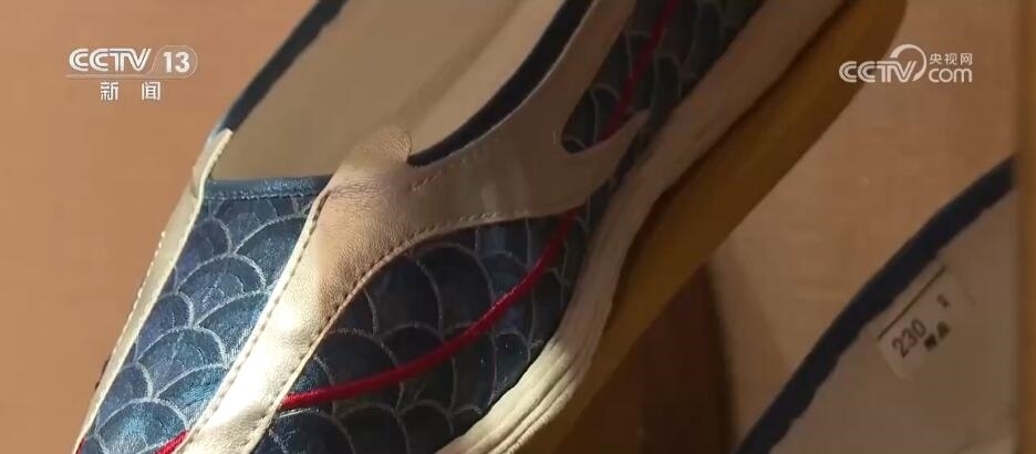北京內(nèi)聯(lián)升鞋業(yè)有限公司總經(jīng)理 程旭:這款鞋是與《山海經(jīng)》聯(lián)名,它每一片龍的龍鱗是可以打開(kāi)。這款鞋我們?nèi)ツ旰凸蕦m聯(lián)名推出的一款漢服鞋,你看這個(gè)叫龍角鞋,還有龍的觸角,有龍鱗,還有龍的須子,搭配這種漢服非常別致、非常時(shí)尚。
