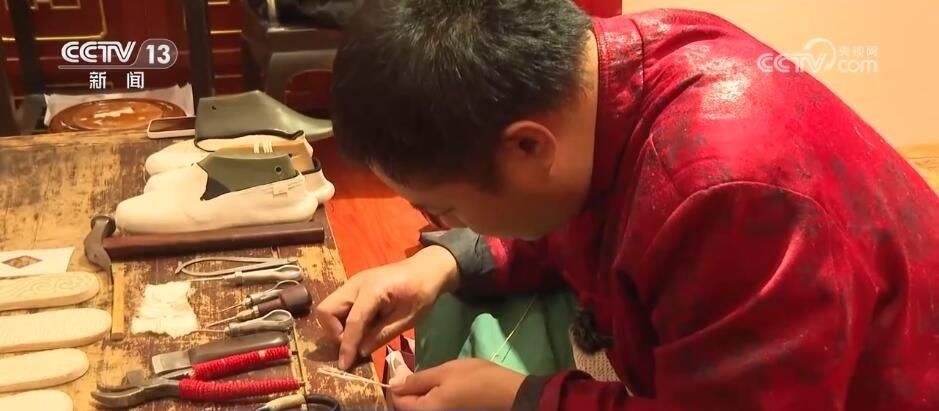 內(nèi)聯(lián)升千層底布鞋制作技藝第五代傳承人 徐文浩:手工納的底用的是一種麻繩,像機(jī)器納底用的就是棉線。這個(gè)麻繩我們也是手工搓出來(lái)的,機(jī)器走不了這種不規(guī)矩的線。這個(gè)麻繩在鞋底里整個(gè)會(huì)膨脹,會(huì)把所有的布鎖在一起,咱們穿的時(shí)候,說(shuō)第一層鞋底磨破了,麻繩都磨斷了,它不會(huì)散,它只會(huì)越磨越薄。像這種機(jī)器納的,這個(gè)線如果說(shuō)磨斷了,這個(gè)底一層一層就開(kāi)始脫落了。