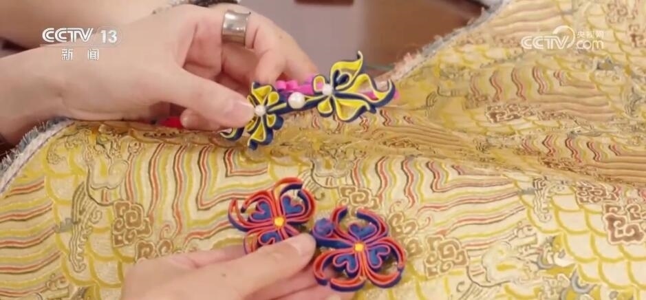 瑞蚨祥中式服裝手工制作技藝傳承人 汪超:這個(gè)就是機(jī)器(制作)的,你會(huì)看到它比較硬,比較板式一點(diǎn)。您看咱們手工的感覺(jué)就很軟,而且每一朵花像有生命力一樣。最不一樣看背面,它要不停地?fù)Q線,不停地去計(jì)算,它哪該換線,哪該換色去織造,所以這也是機(jī)器織造物沒(méi)有辦法替代的很關(guān)鍵的點(diǎn)。