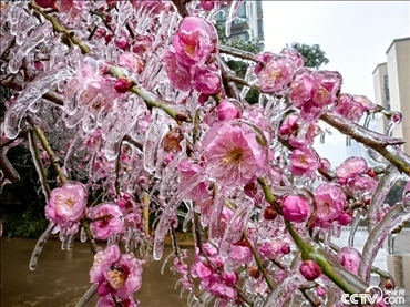 長沙,一夜凍雨后,街頭梅花結(jié)冰。