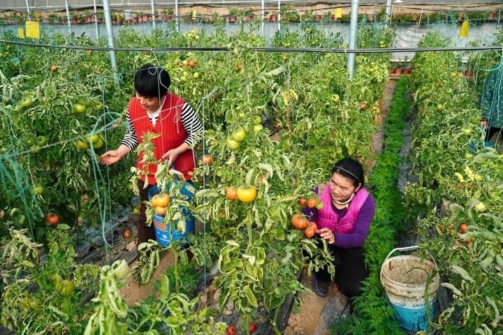 2024年2月6日,在山東省臨邑縣臨南鎮(zhèn),蔬菜大棚種植戶(hù)在收獲西紅柿。新華社記者 徐速繪 攝