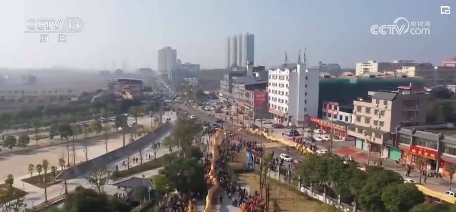 2月10日上午,在廣東韶關南雄市珠璣古巷,一場盛大的九十九節(jié)龍巡游熱鬧上演。九十九節(jié)龍的龍頭由五種顏色繪制,兩額長著長角、兩邊附有魚鱗片,金光閃閃、色彩鮮艷,龍首龍尾還粘有九十九朵長壽之花。它在珠璣古巷內巡游,為父老鄉(xiāng)親祈福,并分別在珠璣牌坊、百姓堂列隊,用龍身擺出“龍年大吉”“天下太平”的新年祝福。