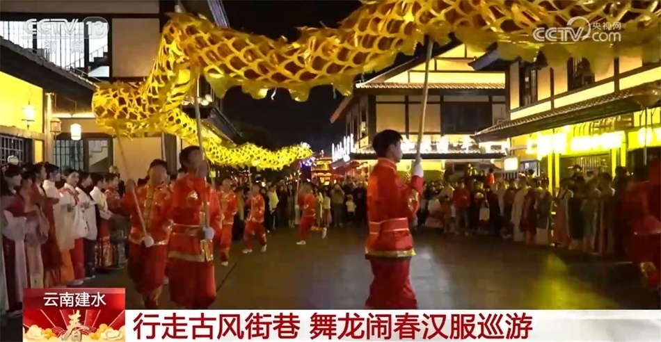 在云南紅河州建水縣紫陶里漢唐街區(qū),一場(chǎng)舞龍鬧春漢服巡游活動(dòng)拉開了序幕。舞龍隊(duì)伍一路閃轉(zhuǎn)騰挪,一條黃色長龍奮力舞動(dòng),忽高忽低,飄忽飛逸。身著華美漢服的姑娘行走在古風(fēng)街巷間,一種古樸幽遠(yuǎn)的韻味撲面而來。市民與游客在感受建水年味的同時(shí),也體驗(yàn)到中華傳統(tǒng)文化之美。