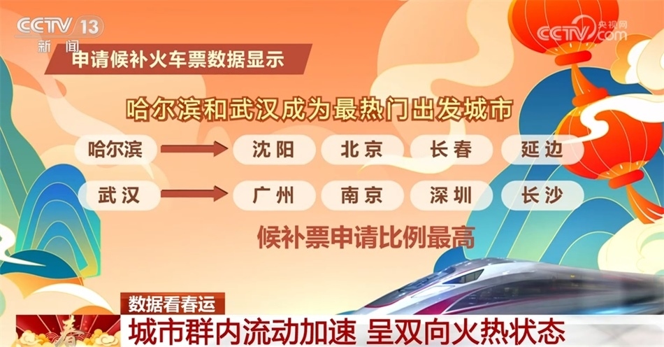 從申請(qǐng)候補(bǔ)火車票的熱門城市看,哈爾濱和武漢延續(xù)昨天的熱度,繼續(xù)成為今天候補(bǔ)票里最熱門的出發(fā)城市,從哈爾濱到沈陽、北京、長(zhǎng)春、延邊,從武漢到廣州、南京、深圳、長(zhǎng)沙的候補(bǔ)票的申請(qǐng)比例最高。提醒有候補(bǔ)票需求的旅客,合理安排出行。