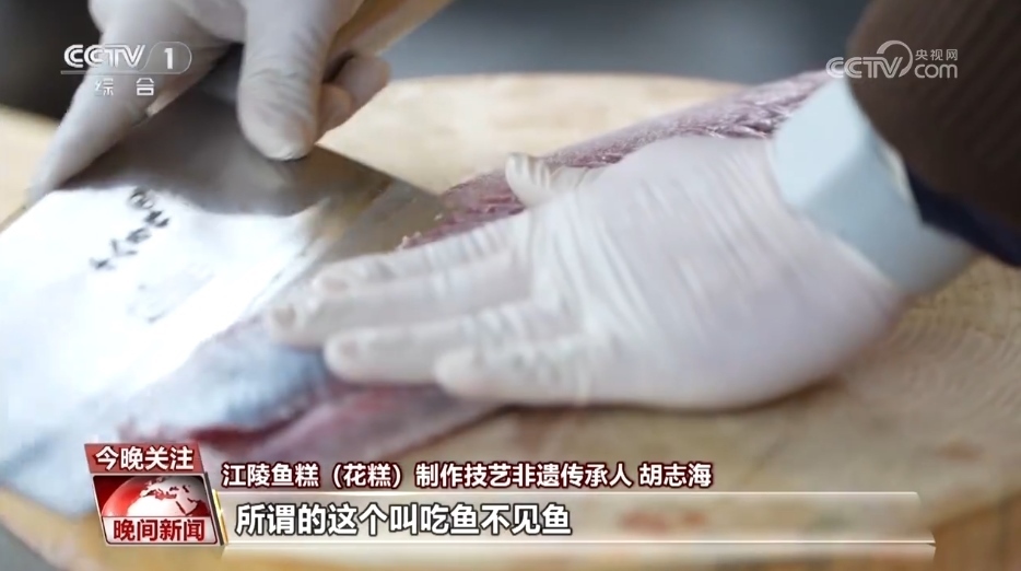 江陵魚糕(花糕)制作技藝非遺傳承人 胡志海:我們把這個魚紅全部要給它剔干凈,打出來的魚糕才會特別的潔白。剔干凈了之后,我們要把這個魚刺給它給剔掉。所謂的這個叫吃魚不見魚,也有魚糕香。