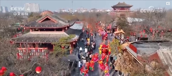 在廣東佛山,龍獅巡游熱鬧開鑼,游客逛新春國潮廟會,鳴鐘擊鼓祈福許愿。