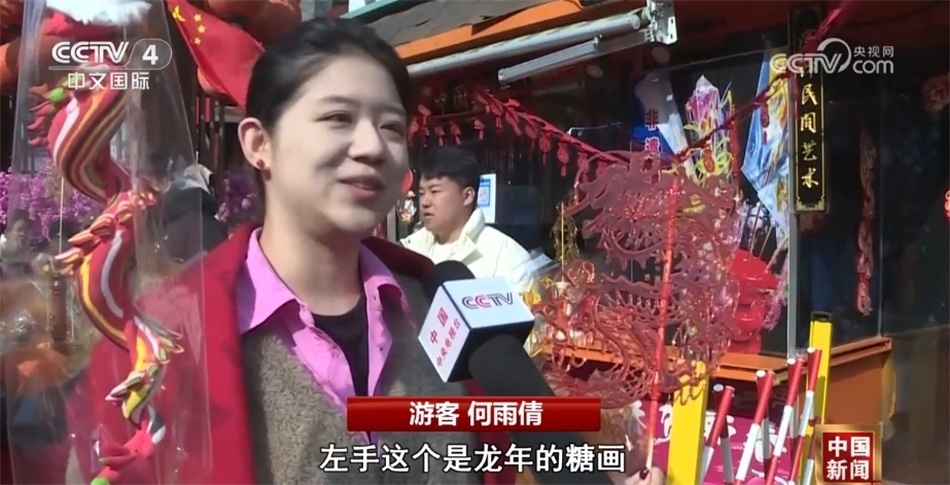 游客何雨倩在接受記者采訪時(shí)說:“逛廟會(huì),過大年,今天最大的驚喜就是看到了這么多的非遺項(xiàng)目,我右手這個(gè)是龍年的生肖面人,左手這個(gè)是龍年的糖畫,特別適合打卡,真是太有年味了?!?/p>