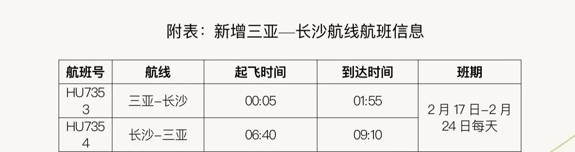 據(jù)悉,在民航局、海南省交通廳的支持下,海南航空積極協(xié)調(diào)申請加班計劃。2月17日至24日期間,海南航空每日新增三亞—長沙往返航班。去程航班HU7353,從三亞起飛時間為凌晨 00:05,到達長沙黃花國際機場時間為01:55;返程航班HU7354,從長沙起飛時間為06:40,到達三亞鳳凰國際機場時間為09:10,以上航班信息以實際查詢?yōu)闇省B每涂赏ㄟ^海南航空官網(wǎng)及APP、微信公眾號及小程序、服務(wù)熱線95339、各直屬售票處及授權(quán)代理購買機票。
