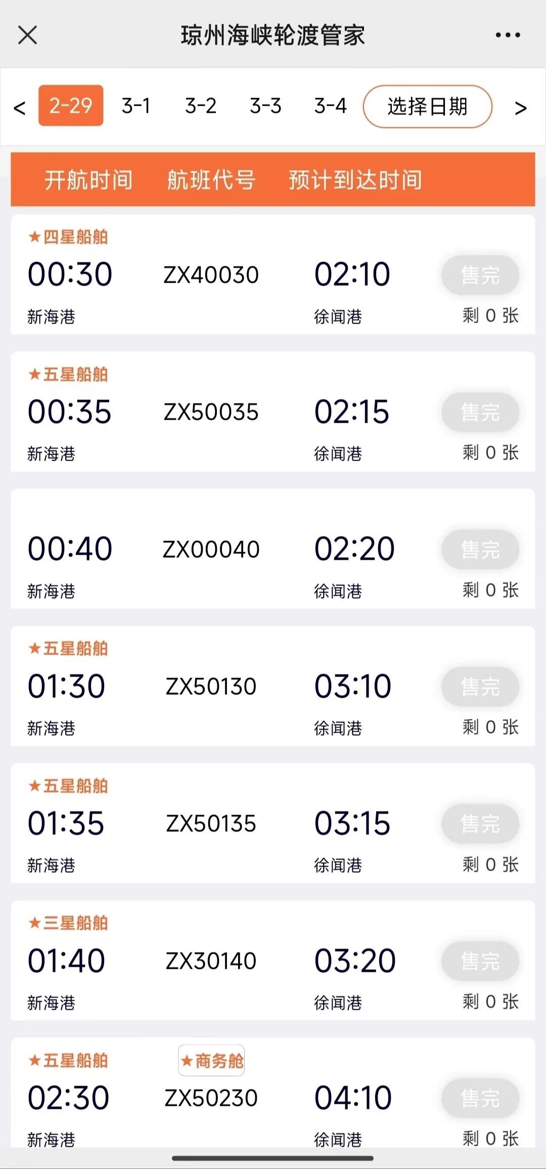 澎湃新聞?dòng)浾?7日上午查詢官方購(gòu)票平臺(tái)“瓊州海峽輪渡管家”發(fā)現(xiàn),實(shí)時(shí)數(shù)據(jù)顯示,海口新海港至徐聞港的新能源車輪渡票,2月17日至2月29日均已售罄。