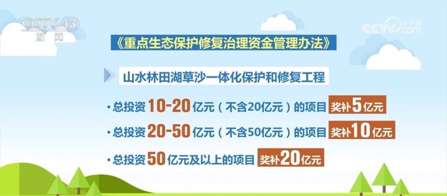 資金具體怎么分配?新辦法指出,山水林田湖草沙一體化保護(hù)和修復(fù)工程總投資10億元—20億元(不含20億元)的項(xiàng)目獎(jiǎng)補(bǔ)5億元;工程總投資20億元—50億元(不含50億元)的項(xiàng)目獎(jiǎng)補(bǔ)10億元;工程總投資50億元及以上的項(xiàng)目獎(jiǎng)補(bǔ)20億元。歷史遺留廢棄工礦土地整治總投資5億元及以上的項(xiàng)目獎(jiǎng)補(bǔ)3億元。