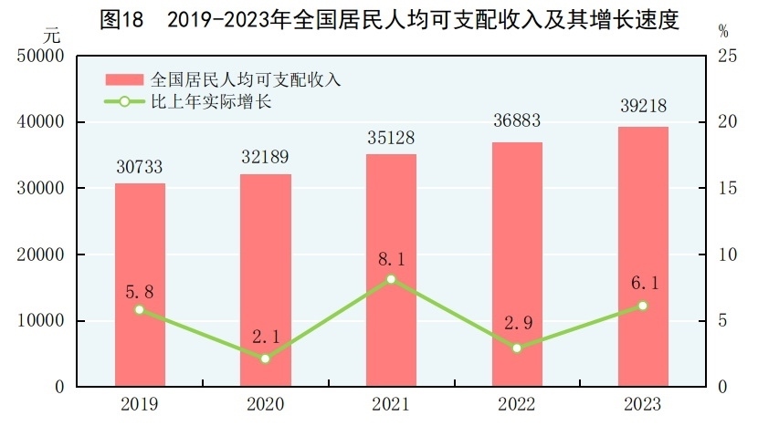 全年全國居民人均可支配收入39218元,比上年增長6.3%,扣除價(jià)格因素,實(shí)際增長6.1%。全國居民人均可支配收入中位數(shù)[56]33036元,增長5.3%。按常住地分,城鎮(zhèn)居民人均可支配收入51821元,比上年增長5.1%,扣除價(jià)格因素,實(shí)際增長4.8%。城鎮(zhèn)居民人均可支配收入中位數(shù)47122元,增長4.4%。農(nóng)村居民人均可支配收入21691元,比上年增長7.7%,扣除價(jià)格因素,實(shí)際增長7.6%。農(nóng)村居民人均可支配收入中位數(shù)18748元,增長5.7%。城鄉(xiāng)居民人均可支配收入比值為2.39,比上年縮小0.06。按全國居民五等份收入分組[57],低收入組人均可支配收入9215元,中間偏下收入組人均可支配收入20442元,中間收入組人均可支配收入32195元,中間偏上收入組人均可支配收入50220元,高收入組人均可支配收入95055元。全國農(nóng)民工人均月收入4780元,比上年增長3.6%。脫貧縣[58]農(nóng)村居民人均可支配收入16396元,比上年增長8.5%,扣除價(jià)格因素,實(shí)際增長8.4%。