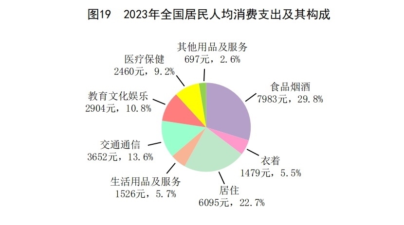 全年全國居民人均消費(fèi)支出26796元,比上年增長9.2%,扣除價(jià)格因素,實(shí)際增長9.0%。其中,人均服務(wù)性消費(fèi)支出[59]12114元,比上年增長14.4%,占居民人均消費(fèi)支出比重為45.2%。按常住地分,城鎮(zhèn)居民人均消費(fèi)支出32994元,增長8.6%,扣除價(jià)格因素,實(shí)際增長8.3%;農(nóng)村居民人均消費(fèi)支出18175元,增長9.3%,扣除價(jià)格因素,實(shí)際增長9.2%。全國居民恩格爾系數(shù)為29.8%,其中城鎮(zhèn)為28.8%,農(nóng)村為32.4%。