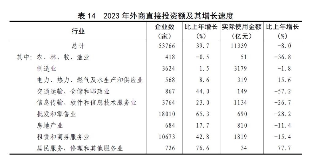 全年外商直接投資新設(shè)立企業(yè)53766家,比上年增長39.7%。實(shí)際使用外商直接投資額11339億元,下降8.0%,折1633億美元,下降13.7%。其中,共建“一帶一路”國家對華直接投資(含通過部分自由港對華投資)新設(shè)立企業(yè)13649家,增長82.7%;對華直接投資額1221億元,下降11.4%,折176億美元,下降16.7%。高技術(shù)產(chǎn)業(yè)實(shí)際使用外資額4233億元,下降4.9%,折610億美元,下降10.8%。
