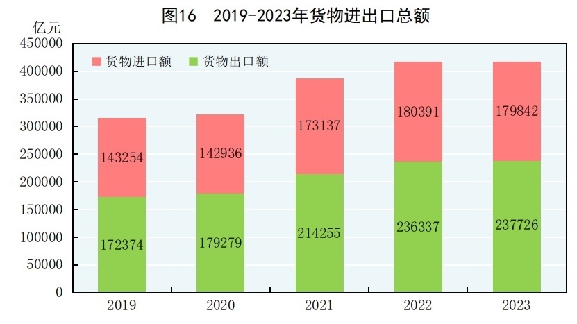 全年貨物進(jìn)出口總額417568億元,比上年增長0.2%。其中,出口237726億元,增長0.6%;進(jìn)口179842億元,下降0.3%。貨物進(jìn)出口順差57883億元,比上年增加1938億元。對共建“一帶一路”[46]國家進(jìn)出口額194719億元,比上年增長2.8%。其中,出口107314億元,增長6.9%;進(jìn)口87405億元,下降1.9%。對《區(qū)域全面經(jīng)濟(jì)伙伴關(guān)系協(xié)定》(RCEP)其他成員國[47]進(jìn)出口額125967億元,比上年下降1.6%。民營企業(yè)進(jìn)出口額223601億元,比上年增長6.3%,占進(jìn)出口總額比重為53.5%。