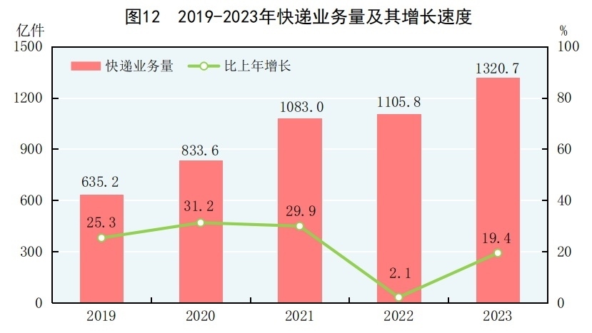 全年完成郵政行業(yè)寄遞業(yè)務(wù)總量[29]1625億件,比上年增長16.8%。郵政業(yè)完成郵政函件業(yè)務(wù)9.7億件,包裹業(yè)務(wù)0.2億件,快遞業(yè)務(wù)量1320.7億件,快遞業(yè)務(wù)收入12074億元。全年完成電信業(yè)務(wù)總量[30]18327億元,比上年增長16.8%。年末移動電話基站數(shù)[31]1162萬個(gè),其中4G基站629萬個(gè),5G基站338萬個(gè)。全國電話用戶總數(shù)189992萬戶,其中移動電話用戶172660萬戶。移動電話普及率為122.5部/百人。固定互聯(lián)網(wǎng)寬帶接入用戶[32]63631萬戶,比上年末增加4666萬戶,其中100M速率及以上的寬帶接入用戶[33]60136萬戶,增加4756萬戶。蜂窩物聯(lián)網(wǎng)終端用戶[34]23.32億戶,增加4.88億戶?;ヂ?lián)網(wǎng)上網(wǎng)人數(shù)10.92億人,其中手機(jī)上網(wǎng)人數(shù)10.91億人?;ヂ?lián)網(wǎng)普及率為77.5%,其中農(nóng)村地區(qū)互聯(lián)網(wǎng)普及率為66.5%。全年移動互聯(lián)網(wǎng)用戶接入流量3015億GB,比上年增長15.2%。軟件和信息技術(shù)服務(wù)業(yè)[35]完成軟件業(yè)務(wù)收入123258億元,比上年增長13.4%。
