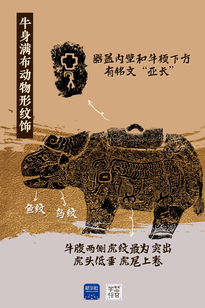 亞長(zhǎng)牛尊是截至目前殷墟發(fā)現(xiàn)的唯一一件牛形青銅容器。“亞”是武官的稱(chēng)謂,“長(zhǎng)”是家族姓氏,墓主人亞長(zhǎng)是商王朝南部“長(zhǎng)”國(guó)的部落首領(lǐng)。