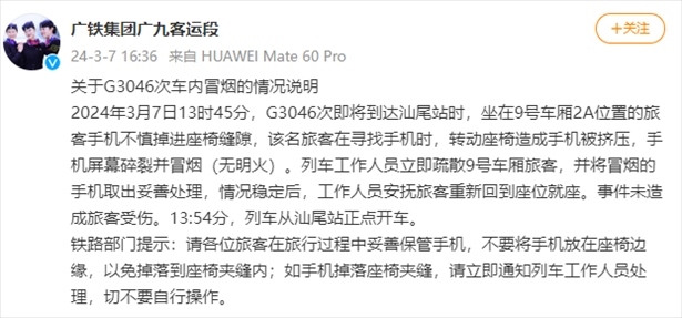 ·廣鐵通報G3046次車內(nèi)冒煙:乘客手機(jī)被擠壓后屏幕碎裂所致。