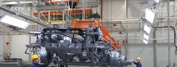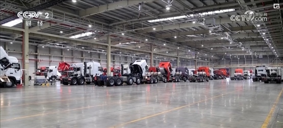 在山東濟(jì)南一家重卡生產(chǎn)企業(yè)的總裝車(chē)間里,貨運(yùn)機(jī)器人將重卡的車(chē)架依次傳送到各工作站,工人熟練地將發(fā)動(dòng)機(jī)、散熱器、輪胎等零件加裝到車(chē)架上。工作人員介紹,一輛重卡從接到訂單開(kāi)始排產(chǎn)到交付客戶(hù)僅需五六天。
