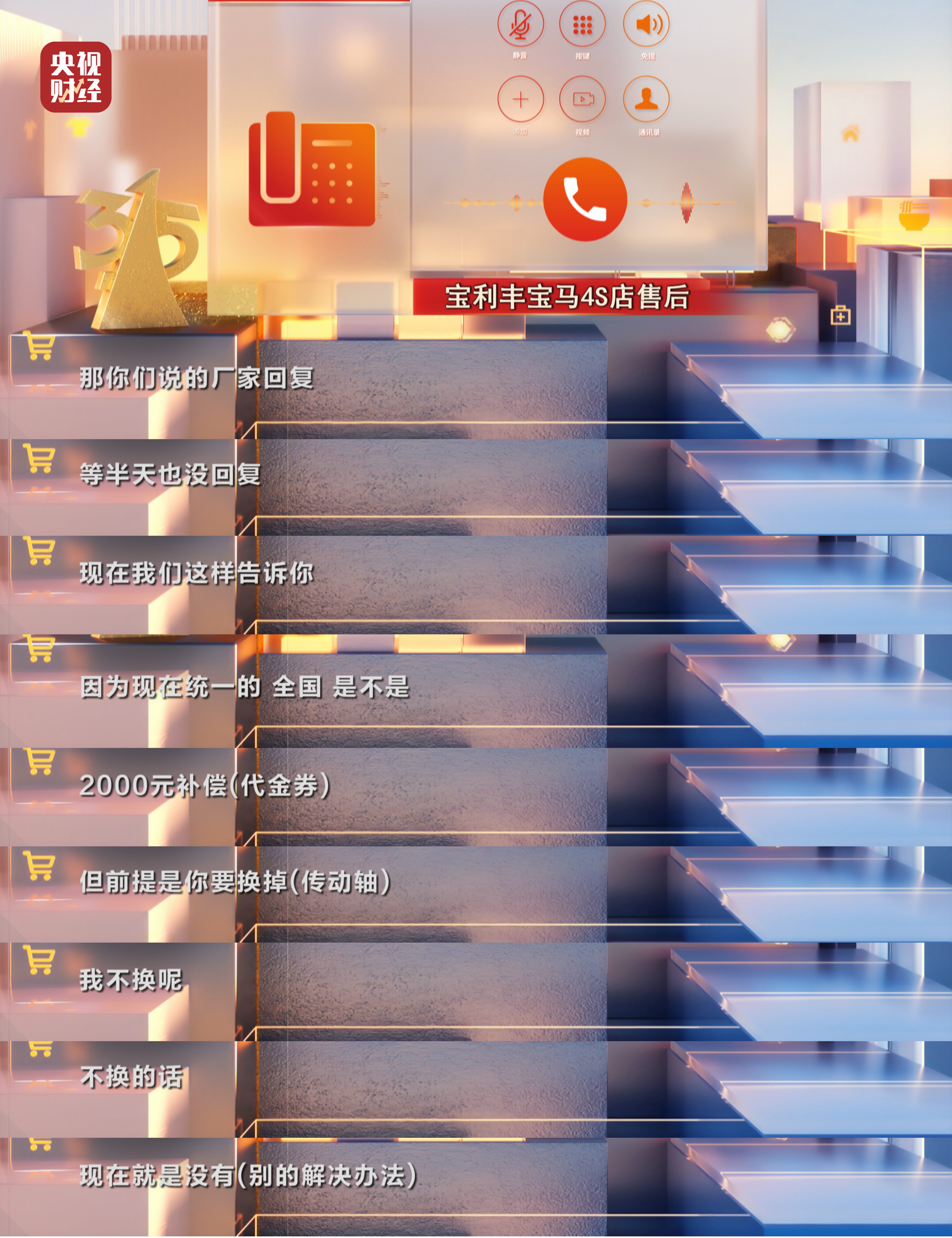 寶馬530Li車主 陳先生:給了2000元的代金券更換傳動軸,我完全接受不了。賠不賠償我覺得不重要,重要的是要保障傳動軸沒有任何的安全隱患。