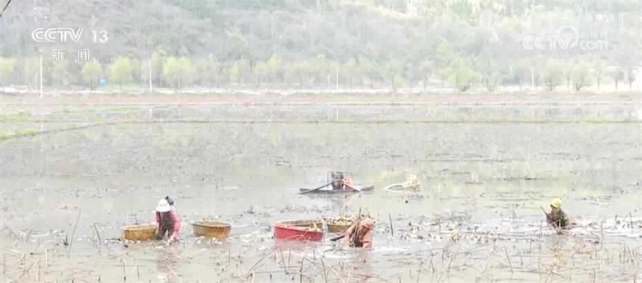 一塊塊水田接連成片,穿著防水服的藕農們身處其中,手拿高壓水槍沖擊水下淤泥,再挖出蓮藕,藕農們會挑選出適宜種植的蓮藕,轉運到另一塊水田進行移栽。