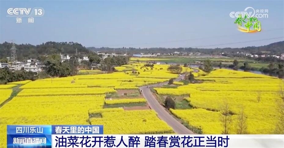 遠(yuǎn)眺峨眉山,近看峨眉河,萬頃金波花如海,流金溢彩百里香?,F(xiàn)在我們看到的是四川樂山市中區(qū) 永和村的近千畝油菜花,在陽光照射下,猶如斑斕的綢帶,妝點(diǎn)了峨眉河沿岸五彩的山色春光。趁著晴好天氣,市民、游客來到戶外踏青賞景,在花田中徜徉流連,感受春日美好時光。
