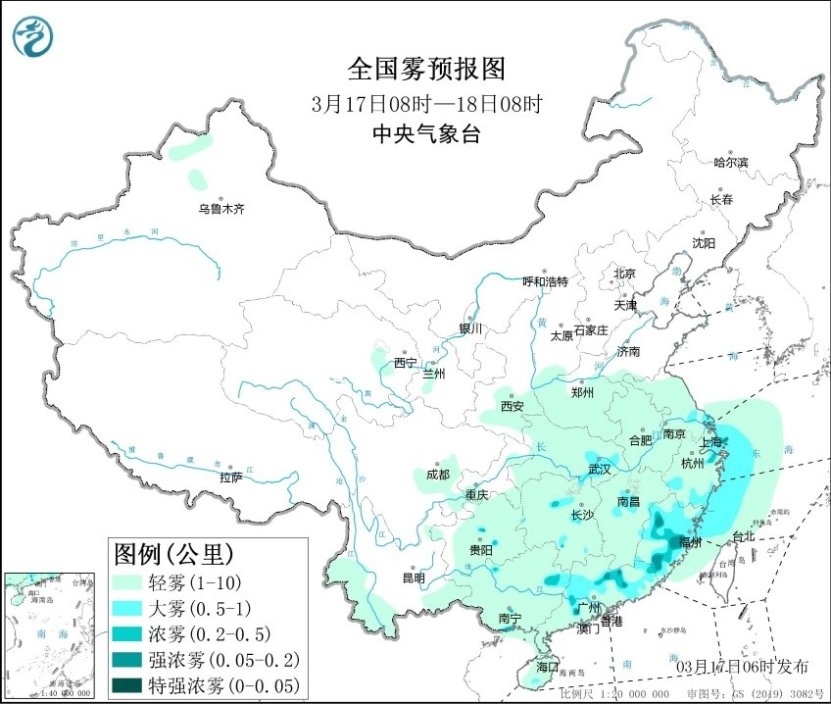 今晨,江蘇、上海、浙江南部、江西中部、福建、廣東、廣西北部、貴州中部等地部分地區(qū)出現(xiàn)大霧天氣,局地能見度不足200米。預計今天上午,上述地區(qū)的大霧天氣還將持續(xù),局地有能見度不足200米的強濃霧。此外,黃海南部海域、東海偏西海域、臺灣海峽將有能見度不足10公里的霧,其中東海西部海域、長江口附近海域、杭州灣附近海域、浙江沿岸海域、福建北部沿岸海域?qū)⒂心芤姸炔蛔?公里的大霧。中央氣象臺今晨繼續(xù)發(fā)布大霧黃色預警。