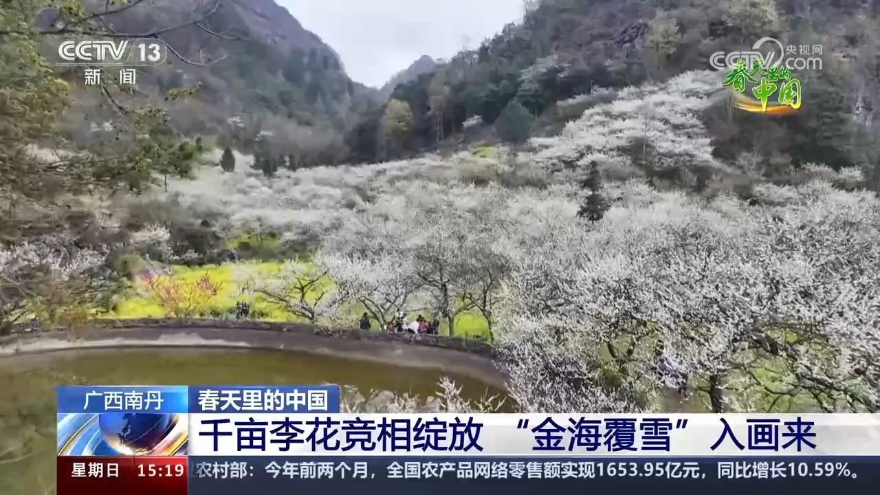 春風送暖三月天,李花滿山澗。跟隨鏡頭,我們來到廣西河池市南丹縣的城關鎮(zhèn)。眼下,千畝李花競相綻放,一簌簌雪白的李花綴滿枝頭,潔白淡雅。漫山李花與金燦燦的油菜花交相輝映,宛如“金海覆雪”,一幅美麗的鄉(xiāng)村春日畫卷徐徐展開。游客紛至沓來,三五成群穿梭其間,或漫步花海,或拍照留影,盡情享受美好春光。