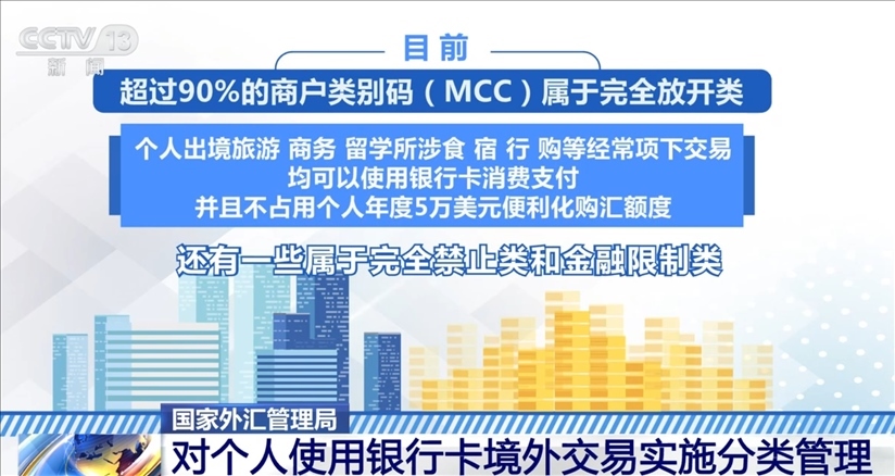 根據規(guī)定,目前,超過90%的商戶類別碼屬于完全放開類,個人出境旅游、商務、留學所涉食、宿、行、購等經常項下交易,均可以使用銀行卡消費支付,并且不占用個人年度5萬美元便利化購匯額度。此外,還有一些屬于完全禁止類和金融限制類。