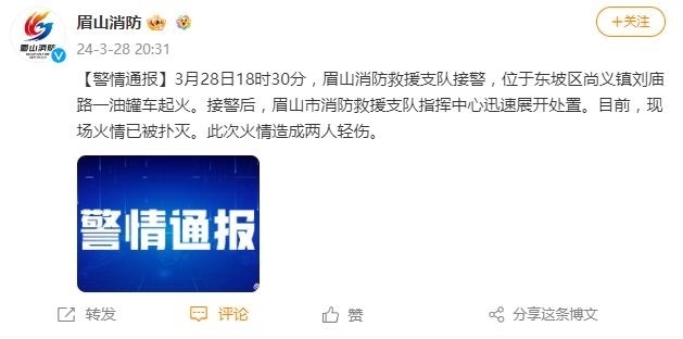 央視網(wǎng)消息:據(jù)眉山消防官微通報(bào),3月28日18時(shí)30分,四川眉山消防救援支隊(duì)接警,位于東坡區(qū)尚義鎮(zhèn)劉廟路一油罐車起火。接警后,眉山市消防救援支隊(duì)指揮中心迅速展開處置。目前,現(xiàn)場(chǎng)火情已被撲滅。此次火情造成兩人輕傷。