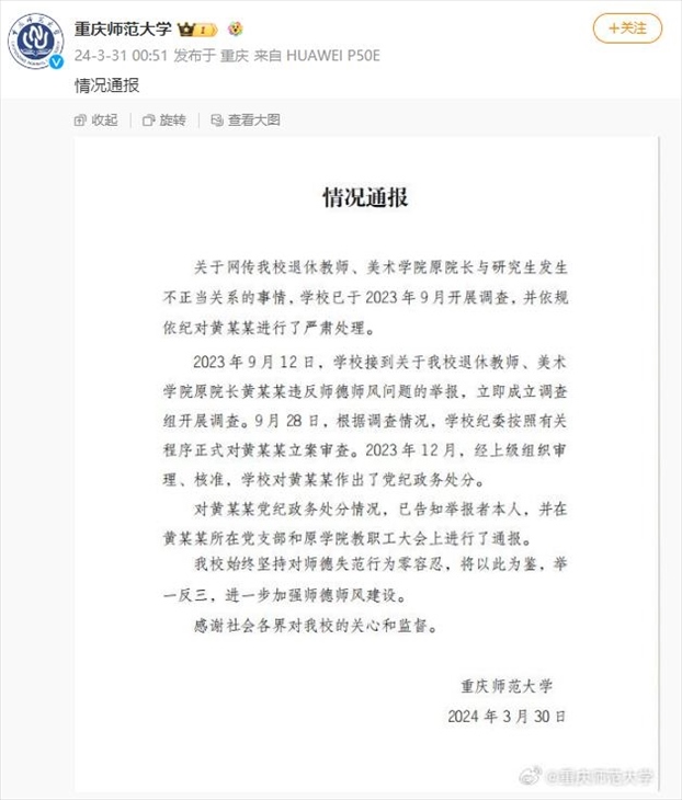 ·重慶師大通報“美院原院長與學(xué)生有不正當(dāng)關(guān)系”:黨紀(jì)政務(wù)處分。