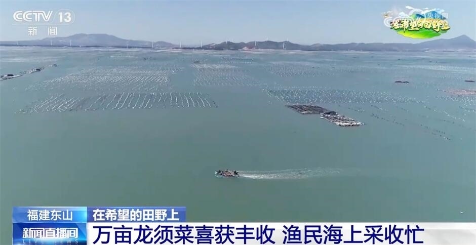 跟隨鏡頭,我們來(lái)到豐收的“海上菜田”。在福建漳州東山縣海域,兩萬(wàn)多畝龍須菜迎來(lái)了采收旺季。從空中看去,“龍須菜田”一塊塊排列整齊。漁船穿梭在“海上菜田”中,漁民們接替收割、搬運(yùn)龍須菜。