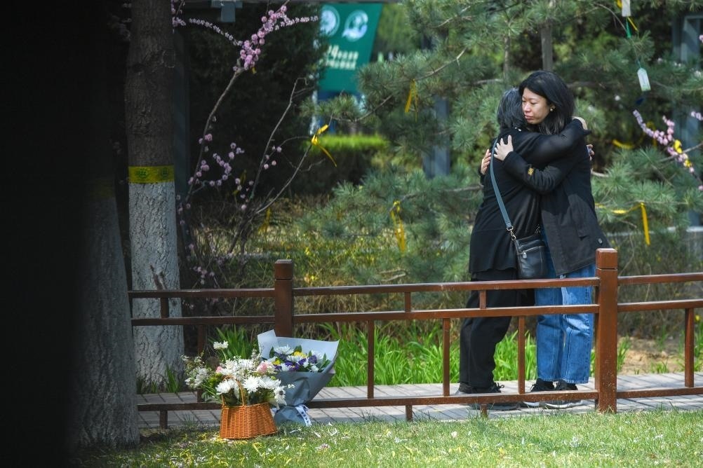 4月2日,在北京長青生命紀(jì)念園自然葬區(qū),自然葬逝者家屬在安放花束、祭奠親人后相擁。新華社記者 鞠煥宗 攝