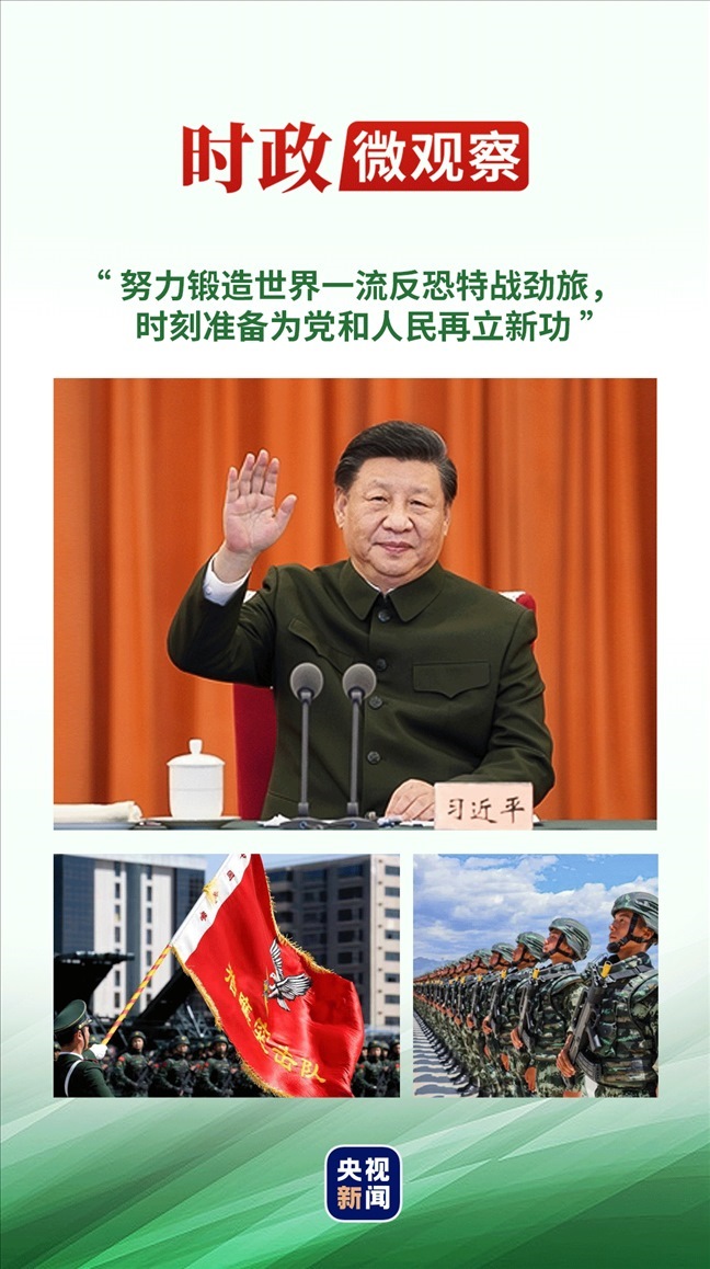 “得知10年來你們堅(jiān)定舉旗鑄魂,苦練特戰(zhàn)本領(lǐng),很好完成了擔(dān)負(fù)的任務(wù),我感到很高興?!绷?xí)近平主席再次寄語,“希望你們再接再厲,不斷錘煉忠誠品格,加強(qiáng)實(shí)戰(zhàn)化針對性訓(xùn)練,發(fā)揚(yáng)一不怕苦、二不怕死戰(zhàn)斗精神,努力鍛造世界一流反恐特戰(zhàn)勁旅,時(shí)刻準(zhǔn)備為黨和人民再立新功?!?/p>