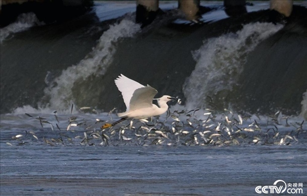 2024年4月9日,南京,秦淮河入江口,白鷺?biāo)姹P(pán)旋,捕食江中小魚(yú)。