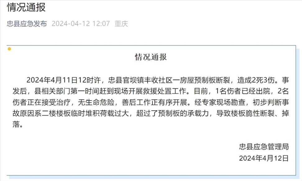 ·重慶一房屋預制板斷裂致2死3傷,鎮(zhèn)政府:已成立專班處理。