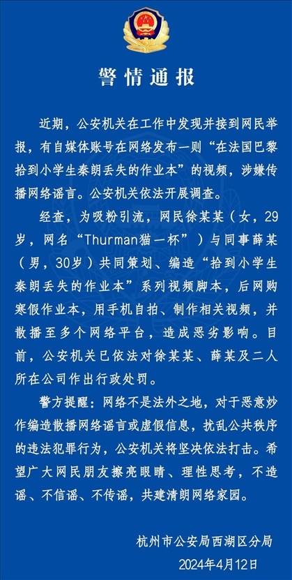 ·警方通報:“秦朗巴黎丟作業(yè)”系編造,涉案公司被處罰。