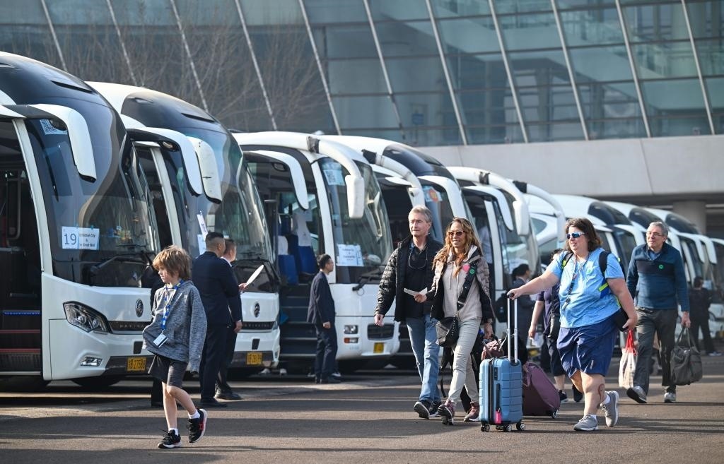 4月7日,外籍旅客準(zhǔn)備搭乘大巴車前往京津旅游景點(diǎn)。新華社記者 孫凡越 攝