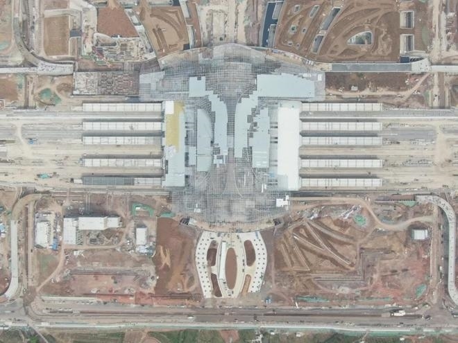 車站采用鋼結(jié)構(gòu)加鋁鎂錳板金屬屋面,整體空間造型提煉和吸取了明代傳統(tǒng)建筑造型特點(diǎn),結(jié)合傳統(tǒng)與現(xiàn)代的設(shè)計(jì)手法,打造具有“風(fēng)水寶地,祥瑞所鐘”設(shè)計(jì)理念的地域性地標(biāo)建筑。目前,站房主體結(jié)構(gòu)已施工完畢,正在進(jìn)行屋面鋼桁架施工。