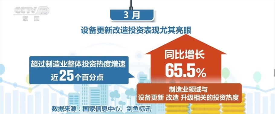 制造業(yè)領(lǐng)域則更為突出,1—2月,制造業(yè)投資熱度指數(shù)同比增長13.3%,3月迅速提升至40.6%,遠(yuǎn)高于全國總體投資熱度增速。設(shè)備更新改造投資表現(xiàn)尤其亮眼,3月,制造業(yè)領(lǐng)域與設(shè)備更新、改造、升級相關(guān)的投資熱度同比增長65.5%,超過制造業(yè)整體投資熱度增速近25個百分點(diǎn)。