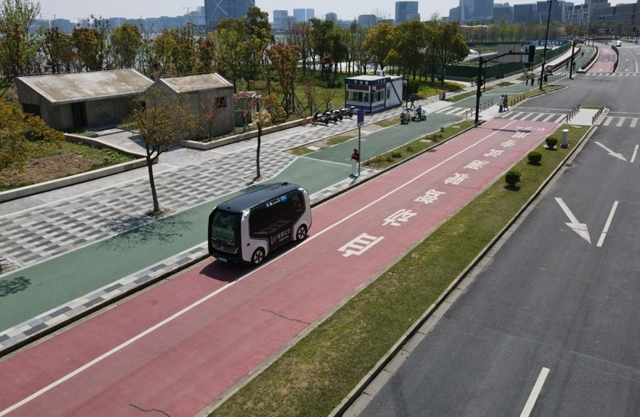 在中國(guó)(上海)自由貿(mào)易試驗(yàn)區(qū)臨港新片區(qū),一輛無(wú)人駕駛汽車行駛在自動(dòng)駕駛測(cè)試專用路上(無(wú)人機(jī)照片,2024年4月9日攝)。