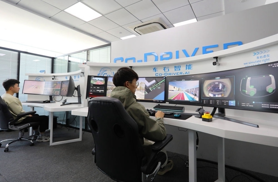 在位于中國(guó)(上海)自由貿(mào)易試驗(yàn)區(qū)臨港新片區(qū)的一家智能駕駛企業(yè),工作人員通過(guò)無(wú)人駕駛汽車遠(yuǎn)程監(jiān)管平臺(tái)的實(shí)時(shí)畫(huà)面,結(jié)合電子地圖對(duì)在自動(dòng)駕駛測(cè)試專用路上行駛的車輛進(jìn)行監(jiān)管(2024年4月9日攝)。