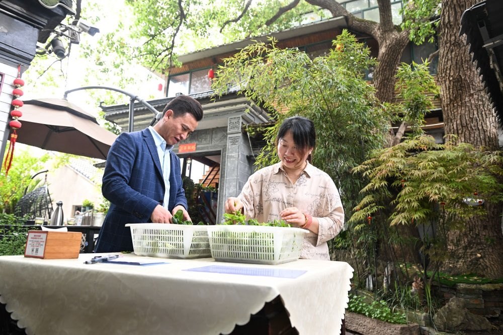 2024年4月11日,在江蘇省蘇州市吳中區(qū)金庭鎮(zhèn),退捕漁民沈雪榮和妻子沈燕燕在自家經(jīng)營的農(nóng)家樂“美味漁家蟹園”擇菜?!巴瞬逗?,太湖的生態(tài)環(huán)境越來越好,游客越來越多,我們家的農(nóng)家樂生意也越來越紅火。”沈雪榮感慨道。