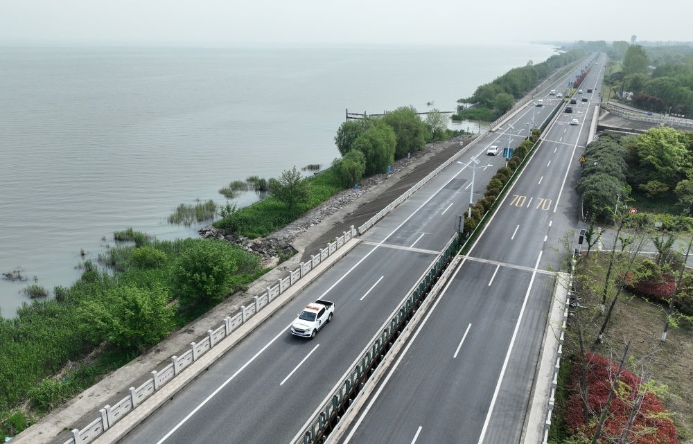 2024年4月11日,浙江省湖州市吳興區(qū)綜合行政執(zhí)法局高新區(qū)中隊執(zhí)法人員駕車在太湖沿岸巡查(無人機(jī)照片)。