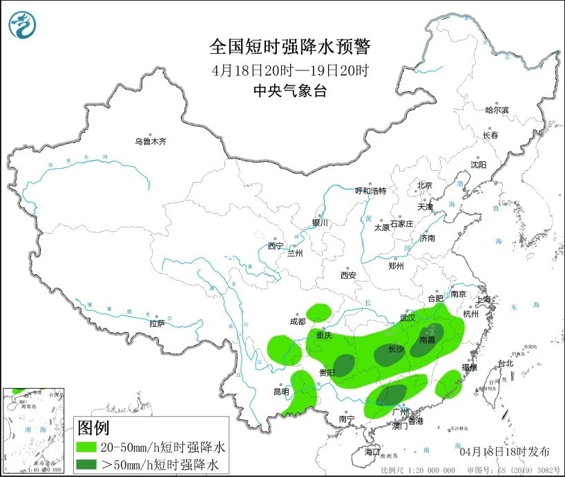 預(yù)計(jì)4月18日20時至19日20時,貴州中東部、湖南中南部、江西、浙江西南部、廣西北部、廣東北部、福建南部等地的部分地區(qū)將有8-10級雷暴大風(fēng)或冰雹天氣,其中貴州東部、湖南中南部、江西中北部、廣西東北部、廣東北部等地的部分地區(qū)將有10級以上雷暴大風(fēng),局地風(fēng)力可達(dá)11級以上;四川東部和南部、重慶南部、貴州、湖北東南部、安徽南部、湖南、江西、浙江西部、福建西北部和南部、云南東南部、廣西東北部、廣東北部等地將有小時雨量大于20毫米的短時強(qiáng)降水天氣,其中貴州東部、湖南中南部、江西中部、廣東中北部等地的部分地區(qū)最大小時雨量大于50毫米,局地可達(dá)70毫米以上。