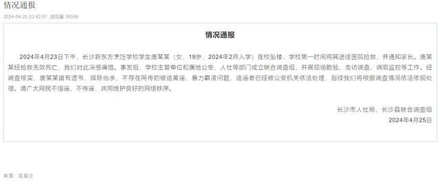·湖南長沙縣通報“女生跳樓身亡”:不存在網(wǎng)傳被造黃謠、暴力霸凌問題,造謠者已被依法處理。