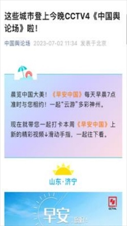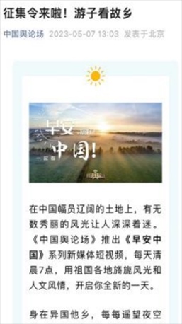 每天早7點(diǎn),新媒體用戶一起床,打開《中國輿論場》,美妙的音樂喚醒耳朵,美麗的風(fēng)景賞心悅目,再加上一句經(jīng)典典故,迎接美美的一天!