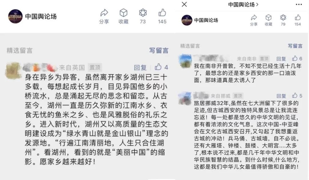 “早安中國切口新穎,有文化屬性和微記錄的氣質(zhì)?!薄懊看纹驳慕Y(jié)語字幕,都是從哪里選的?每天,都給我學(xué)習(xí)的機(jī)會?!薄皩I(yè)微記錄是媒體融合最寬廣的路。”……《早安中國》真真切切地緩解了許多海內(nèi)外網(wǎng)友的故土思鄉(xiāng)情切,也收到了來自四面八方的認(rèn)可及反饋。《中國輿論場》節(jié)目持續(xù)發(fā)出“游子看故鄉(xiāng)”征集令,請海外華僑華人說出對家鄉(xiāng)的思念和心中最想“打卡”的祖國美景。