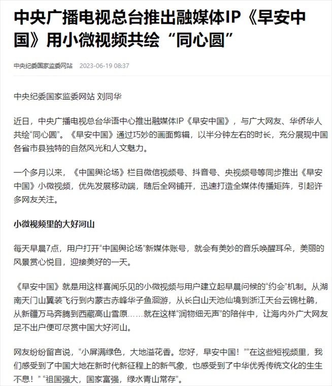 一年后的今天,《早安中國》不僅讓越來越多的網(wǎng)友在每天早晨7:00習(xí)慣性地用“早安”短視頻跟親朋好友道聲問候、來場“約會”,更重要的是它將總書記喜歡的典故與中國各地獨(dú)特的自然和人文景觀相結(jié)合,與海外華僑華人建立起有效連接。