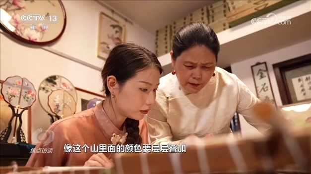 盧建英是蘇州當?shù)赜忻奶K繡代表性傳承人。記者見到她的時候,她正在指導(dǎo)女兒刺繡。