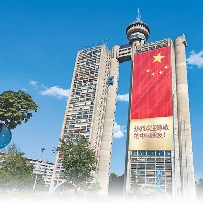 塞爾維亞首都貝爾格萊德市內(nèi)的建筑上懸掛起巨幅五星紅旗和中文標語,歡迎習(xí)近平主席到訪。本報記者 謝亞宏攝